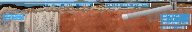总重3800吨、长130米的“深江1号”盾构机于2022年初展开掘进,从东莞虎门向广州南沙方向掘进5360米,最大埋深达116米。盾构机需穿越15种地层、6种复合地质、35条断裂带。其中全断面硬岩段长达2.75千米,花岗岩强度最高达124.6兆帕;断裂带及分支区间总长490米,最宽的15号断裂带宽32.5米,施工难度与风险极高。