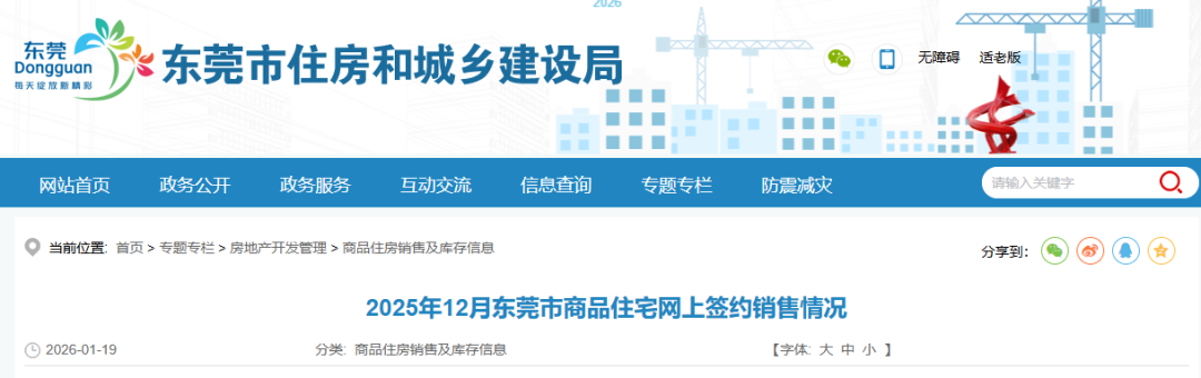 1月19日,东莞市住房和城乡建设局官网公布了2025年12月东莞市商品住宅网上签约销售情况。