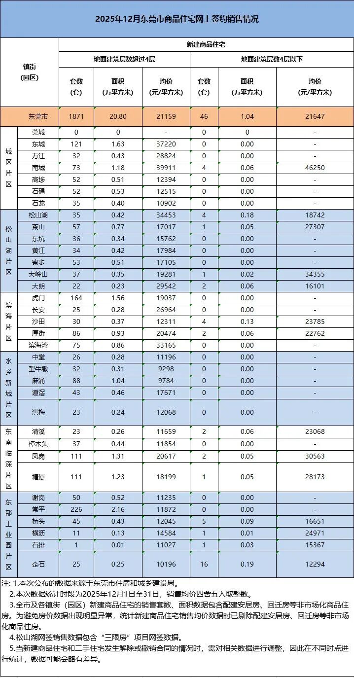 官网数据显示,2025年12月东莞新建商品住宅地面建筑层数超过4层的新房网签1871套,较上月新增了825套,均价为21159元/㎡,相较11月份的19956元/㎡,上涨了1203元/㎡。