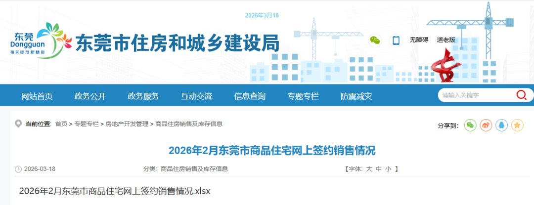 东莞最新房价来啦!3月18日,东莞市住房和城乡建设局官网公布《2026年2月东莞市商品住宅网上签约销售情况》。