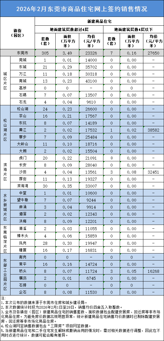 数据显示,2026年2月东莞新房网签共成交312套,其中地面建筑层数超过4层的共签305套,均价为23326元/㎡,具体我们一起来看。