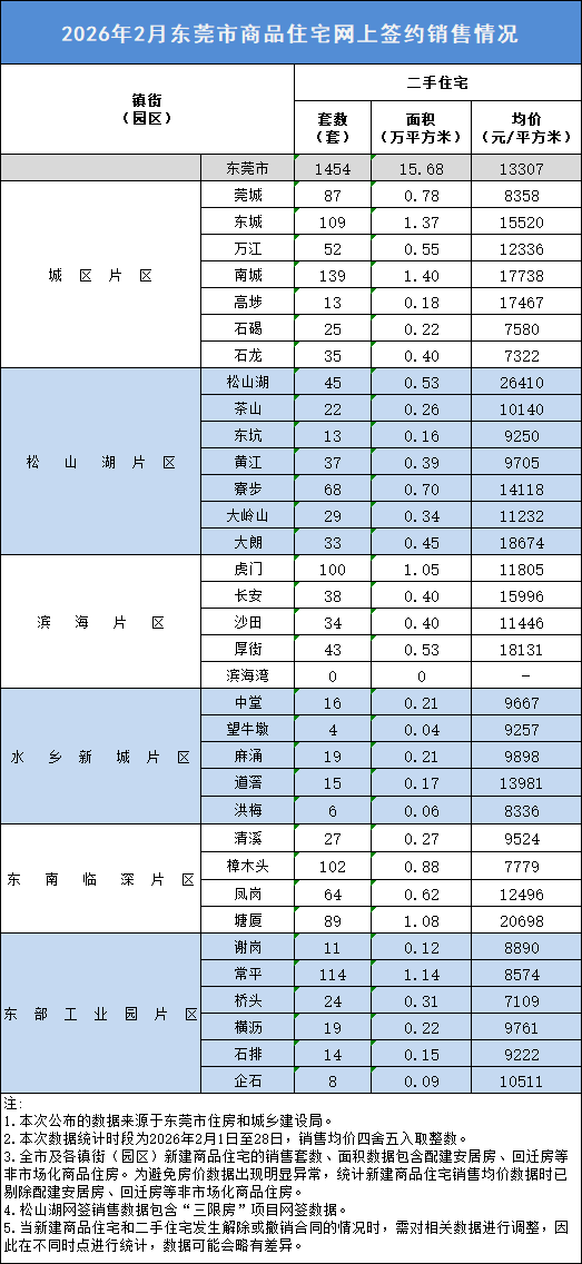 官方数据显示,2026年2月,东莞二手住宅网签套数为1454套,较上月减少了1589套;网签均价为13307元/㎡,较上月的13607元/㎡有所下降。
