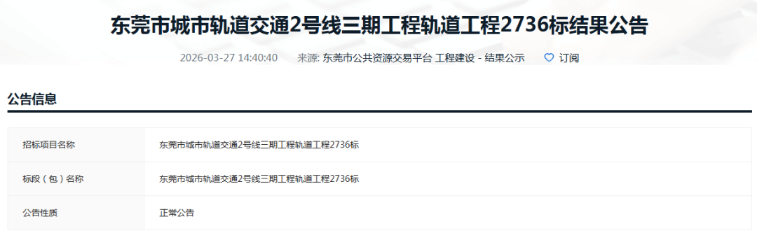 3月27日下午,广东省公共资源交易平台公示了东莞市城市轨道交通2号线三期工程轨道工程2736标的中标结果,中铁四局集团有限公司以3.15亿元中标。这标志着2号线三期即将进入轨道施工阶段。