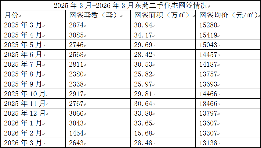 数据显示,2026年3月,东莞二手住宅网签2643套,环比大增82%;网签面积为28.48平方米,环比大增82%;网签均价为13138元/平方米,环比微降1%。