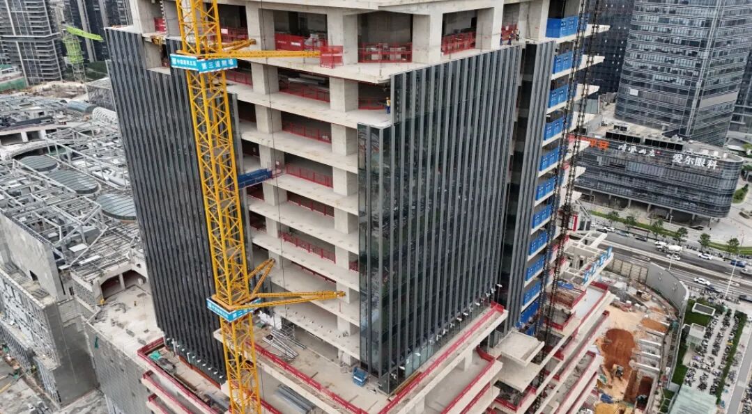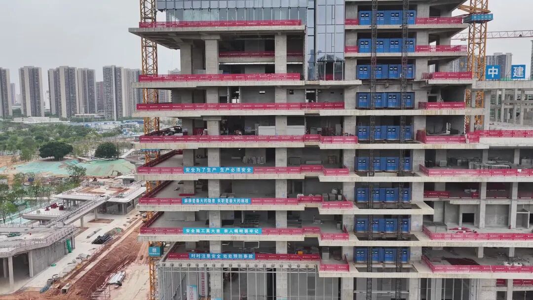 目前,项目已全面展开幕墙安装和装饰装修工作,正朝着今年12月30日竣工目标全力冲刺。