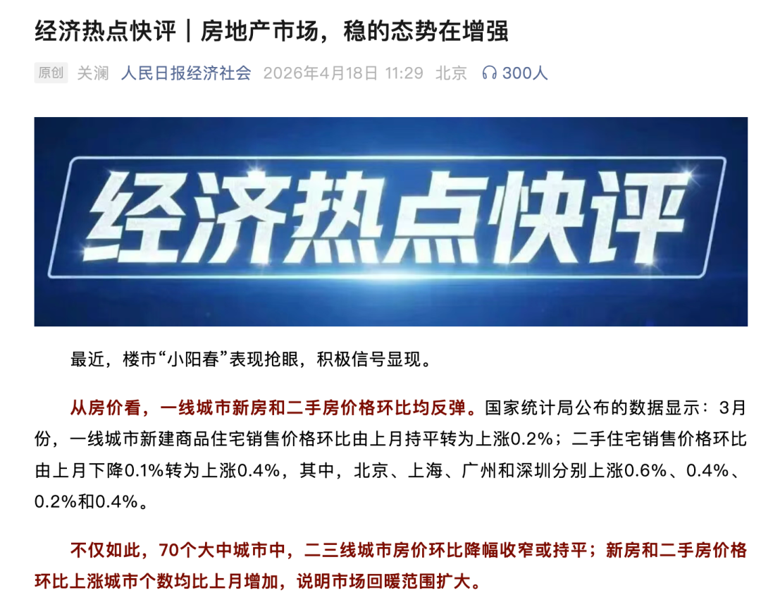 文章引用国家统计局数据佐证:3月份,一线城市新建商品住宅销售价格环比由上月持平转为上涨0.2%,二手住宅销售价格环比由上月下降0.1%转为上涨0.4%。