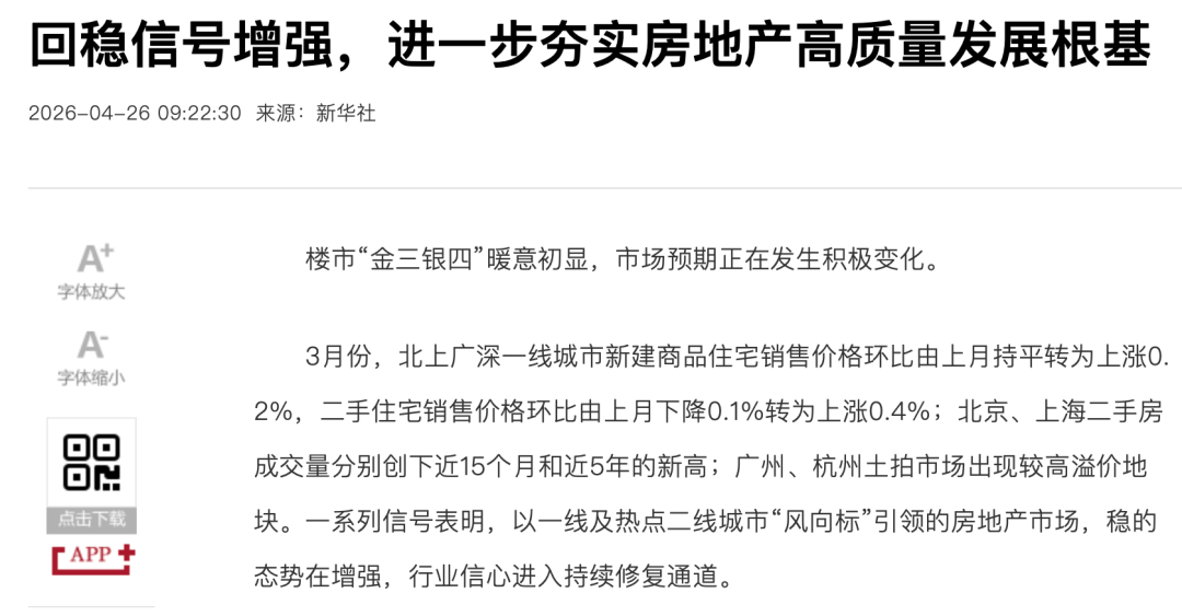 4月22日,新华社深化“筑底”判断。在《回稳信号增强,进一步夯实房地产高质量发展根基》一文中,新华社强调,此轮回暖并非短期波动,而是“深度调整后的筑底回暖”。