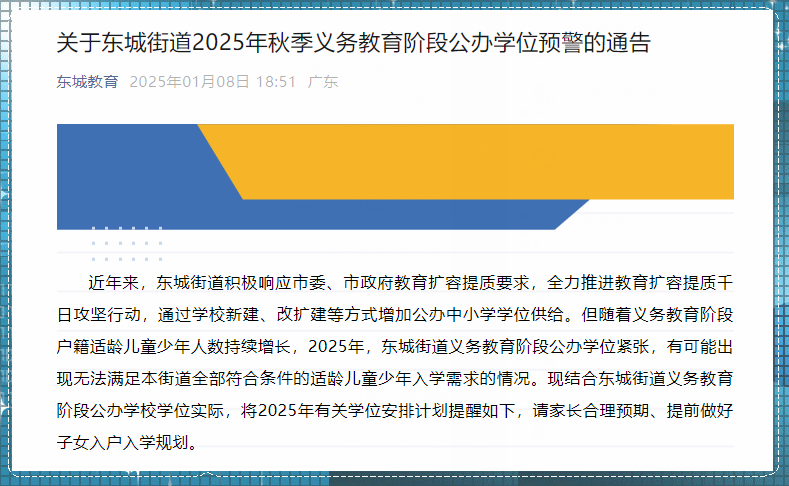 发愁不是没有原因的,学位太紧张了!近期,“东莞多个镇街接连发布公办学位预警!”的消息刷爆朋友圈,东城赫然在列。“提前做好子女入户入学规划”成为目前广大家长的头等大事。