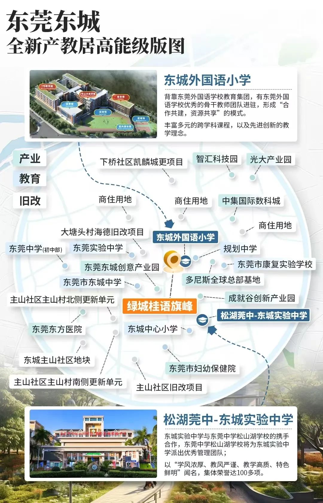 不仅如此!去年底,东城街道办事处与东莞中学松山湖学校集团化办学签约仪式在东城实验中学举办,标志着东城实验中学正式加入东莞中学松山湖学校教育集团。距离项目约800米的松湖莞中-东城实验中学,将由东莞中学松山湖学校派出优秀管理团队,优势互补,致力于办好家门口的优质学校。