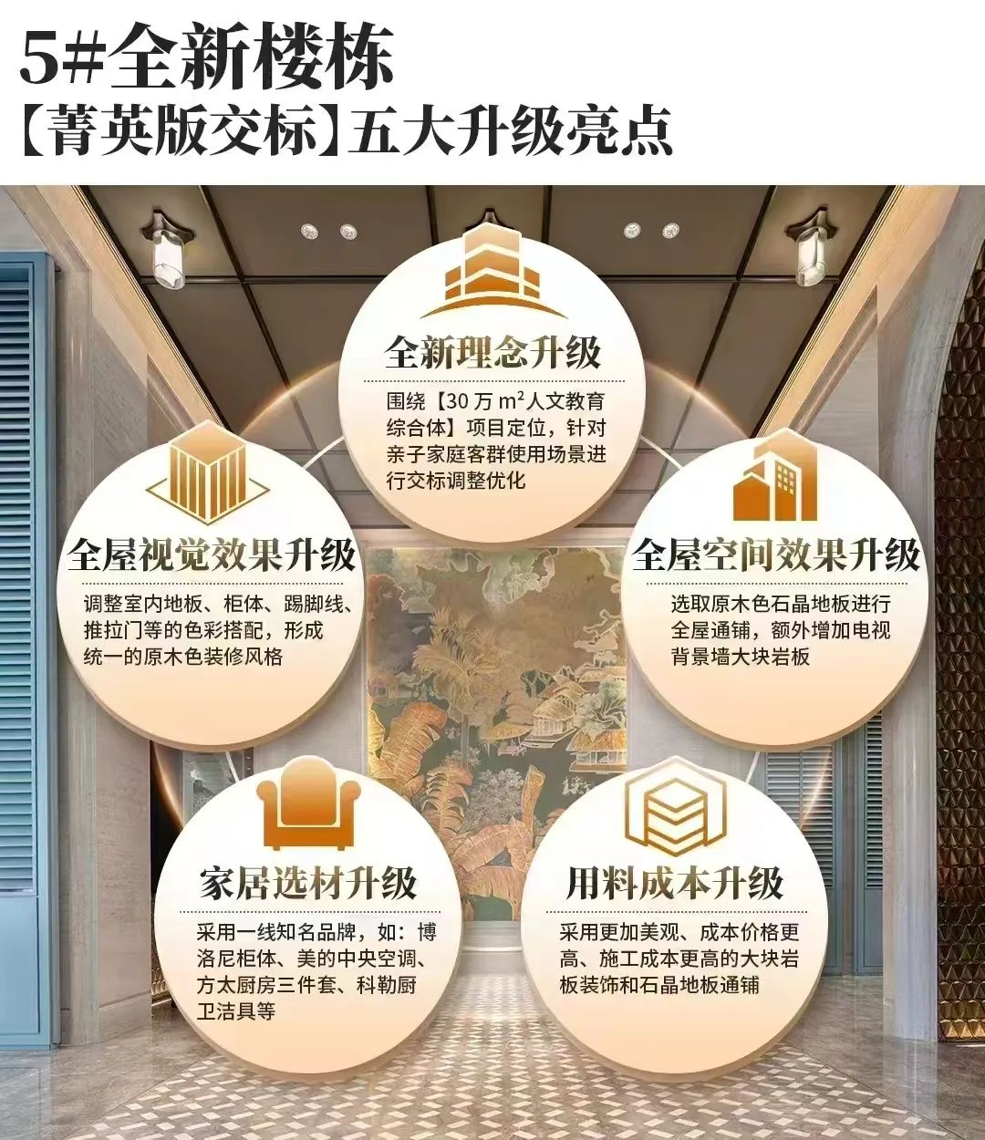 针对亲子家庭客群,绿城桂语旗峰本次加推5号楼,产品为建面约89-118-128㎡三至四房,对交标进行了5大升级。