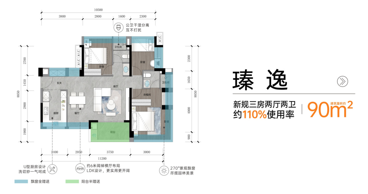 作为松山湖片区首个执行新规的住宅项目,松湖瑧府2号楼,建筑面积约90平方米户型实现阔绰三房两卫,建筑面积约99平方米户型及建筑面积约110平方米户型均做到舒适四房布局,主卧扩面、次卧可三边上床、厨房扩容、80公分深飘窗、0.4窗地比,使用率最高约110%。