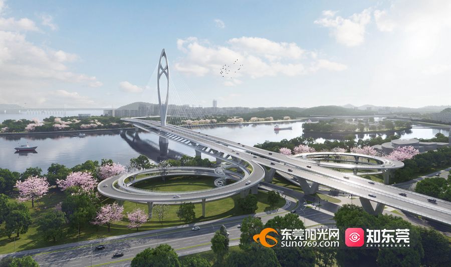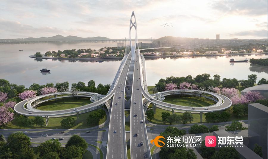 桥梁主塔设计高耸入云,在入海口处犹如湾区之眼、瞩目世界,东岸采用环形匝道落地与长堤路平面交叉,将打造成一座国际一流、湾区领先、独具魅力的标志性桥梁建筑。