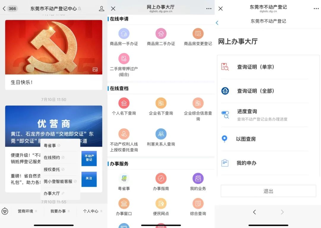 关注“东莞市不动产登记中心”微信公众号,点击菜单栏中“我要办事”→“办事大厅”,即可在线申办不动产高频登记业务以及多项便捷查档、查询服务。