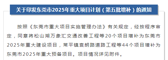 日前,东莞市发展和改革局印发2025年东莞市重大项目计划(第五批增补),全市新增20个重大建设项目,44个重大预备项目。