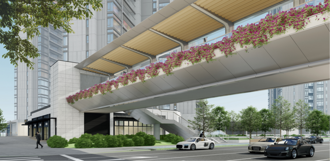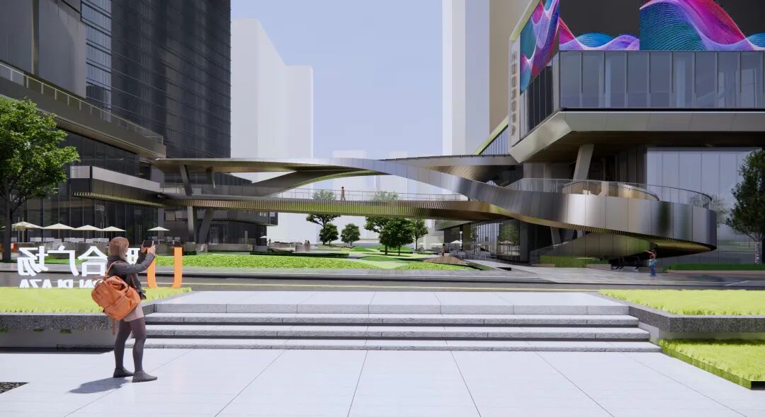 “每条连廊不只是‘过道’,还是精彩的城市生活场景。”梁迪飘说,二层连廊不仅仅是连桥,主体是地块内的二层平台,平台有通道、有节点。节点就是它的活动空间,它是个“容器”,可以装很多东西,比如绿化、盆摘、艺术装置,甚至小型的市集摊位。