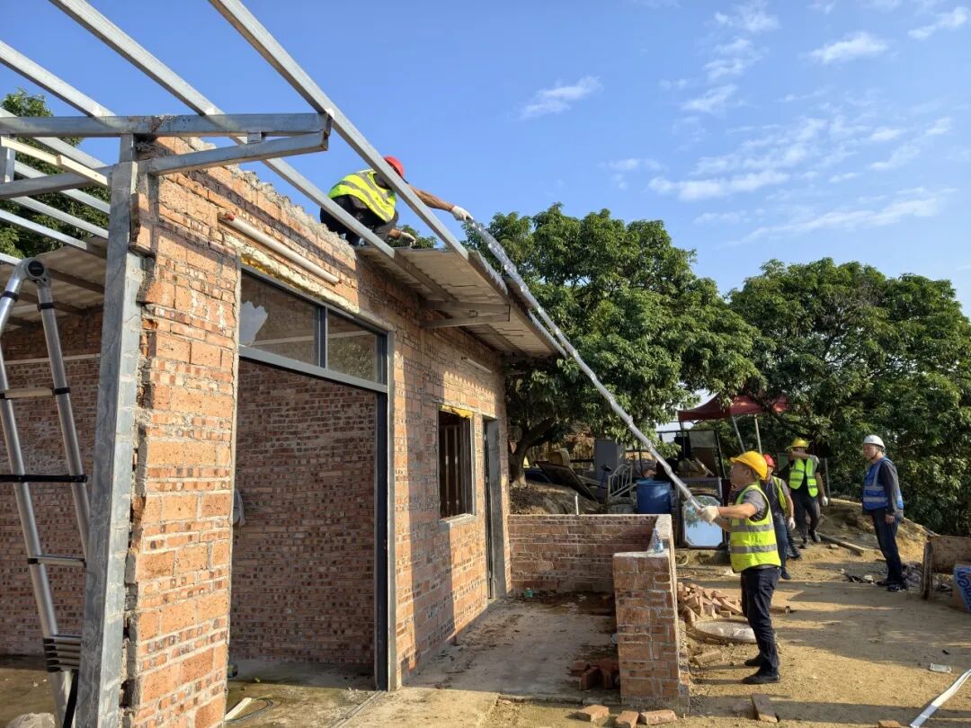 新围社区的某处荔枝林内,一栋在建的房屋叫停。现场拆除工人从屋内搬出家具和生活杂物后,抡起施工锤将房屋拆除。