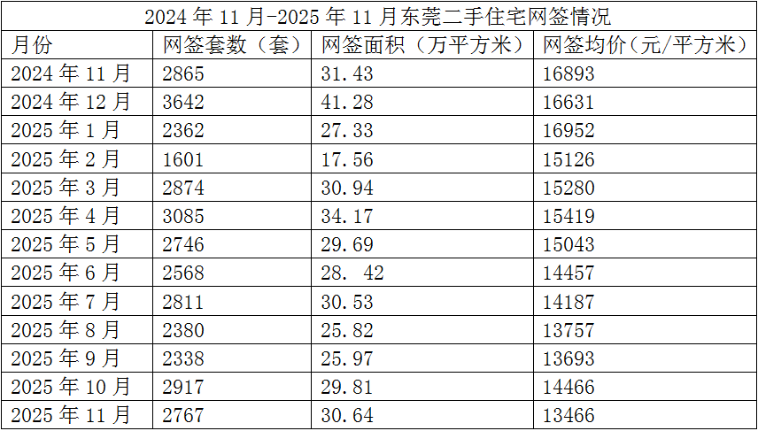 市住建局数据显示,2025年11月,东莞二手住宅网签2767套,环比减少5%;网签面积为30.64万平方米,环比增加3%;网签均价为13466元/平方米,环比下降7%。