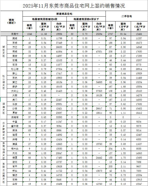 12月12日,东莞市住房和城乡建设局(以下简称“市住建局”)官网发布《2025年11月东莞市商品住宅网上签约销售情况》。数据显示,2025年11月,东莞一手洋房(地面建筑层数超过4层的新建商品住宅)网签均价为19956元/平方米,环比下降4%;二手住宅网签均价为13466元/平方米,环比下降7%。