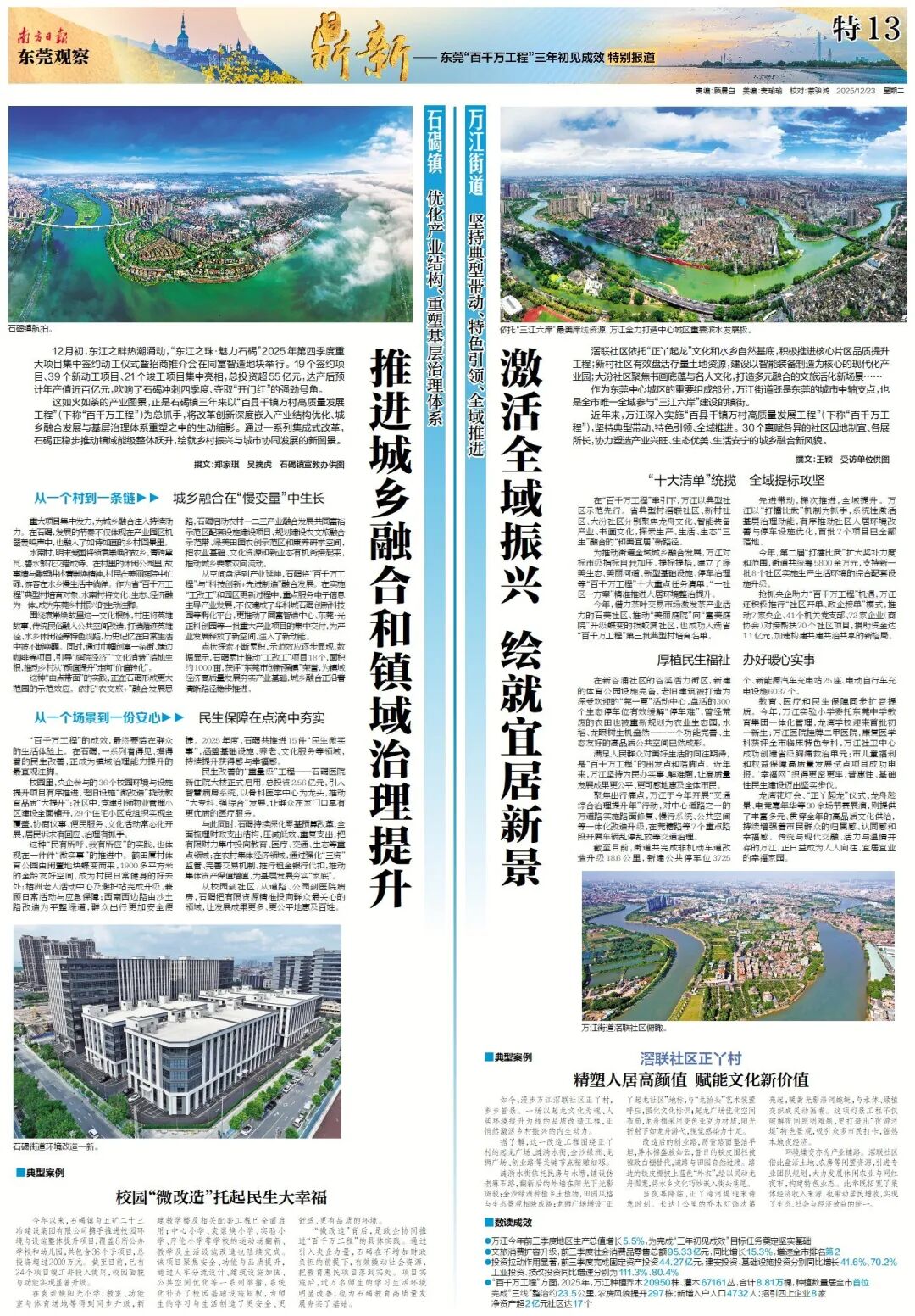 这如火如荼的产业图景,正是石碣镇三年来以“百县千镇万村高质量发展工程”(下称“百千万工程”)为总抓手,将改革创新深度嵌入产业结构优化、城乡融合发展与基层治理体系重塑之中的生动缩影。通过一系列集成式改革,石碣正稳步推动镇域能级整体跃升,绘就乡村振兴与城市协同发展的新图景。