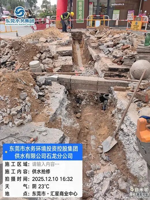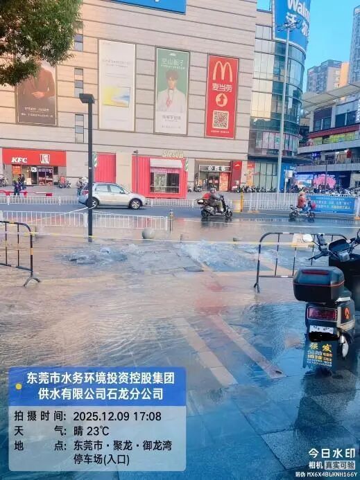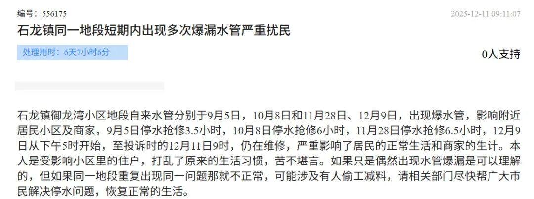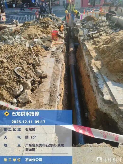 对于网友反馈的该小区多次水管爆漏问题,东莞市水务环境投资控股集团供水有限公司石龙分公司(下称“石龙分公司”)作出回复:经核实,2025年12月9日17:00,石龙分公司位于石龙镇裕兴路438号聚龙御龙湾小区东南门的一条dn315PE供水管道突发爆漏,石龙分公司工作人员于当日17:08到达现场组织开展抢修工作,同时设置临时取水点及发送停水短信通知,该管道已于当日21:27完成抢修并恢复正常供水。