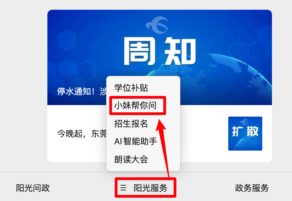2️⃣下方菜单栏中选择“阳光服务”,点击“小妹帮你问”,即可进入报料入口。