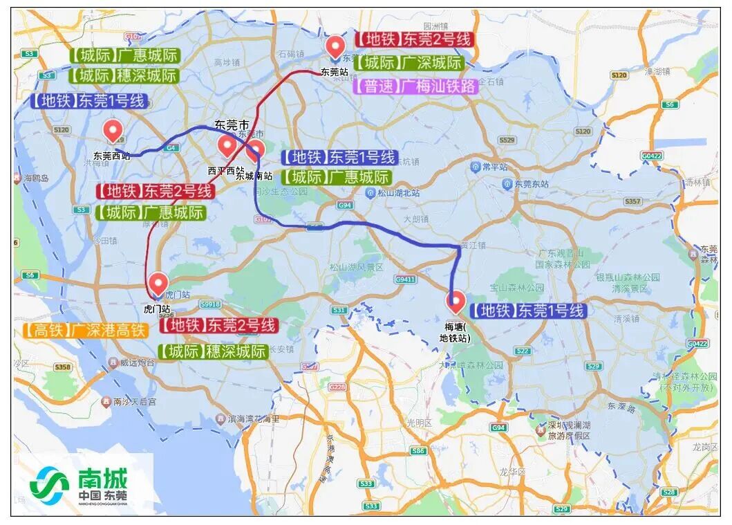 南城交通四通八达。广东城际铁路、东莞地铁1号线、2号线均在此串联交汇;东莞首批5个直升机通航起降点坐落在南城,实现半小时直飞深圳、广州等地,实现大湾区生活高速衔接……