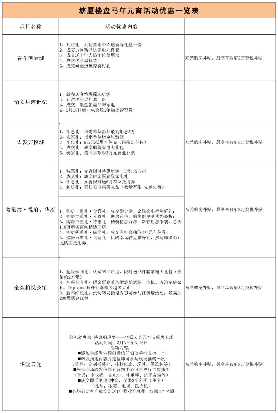 本次房企展销活动将汇聚金众柏悦公馆、大湾区·桂湾府、宏发万悦城、粤港湾·悦府&华府、华堂云光、春晖国际城、怡安星河世纪等塘厦热门楼盘,各项目携专属元宵福利重磅亮相,优惠力度拉满。到访即享新春礼盒、坚果礼盒、精美礼品等暖心好礼,转发互动还能抽现金红包、玩转幸运转盘赢福利;成交福利更是惊喜连连,家电八件套、全屋精装、万元车位抵用券等豪礼随心享,部分楼盘还推出特惠房源,更有砸金蛋赢品牌家电、送1年物业管理费等专属权益。同时,购房可叠加东莞市最高3万元契税补贴,多重优惠加持,置业成本一降再降。