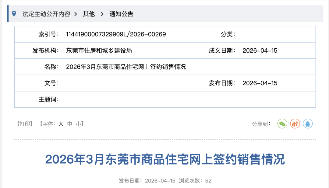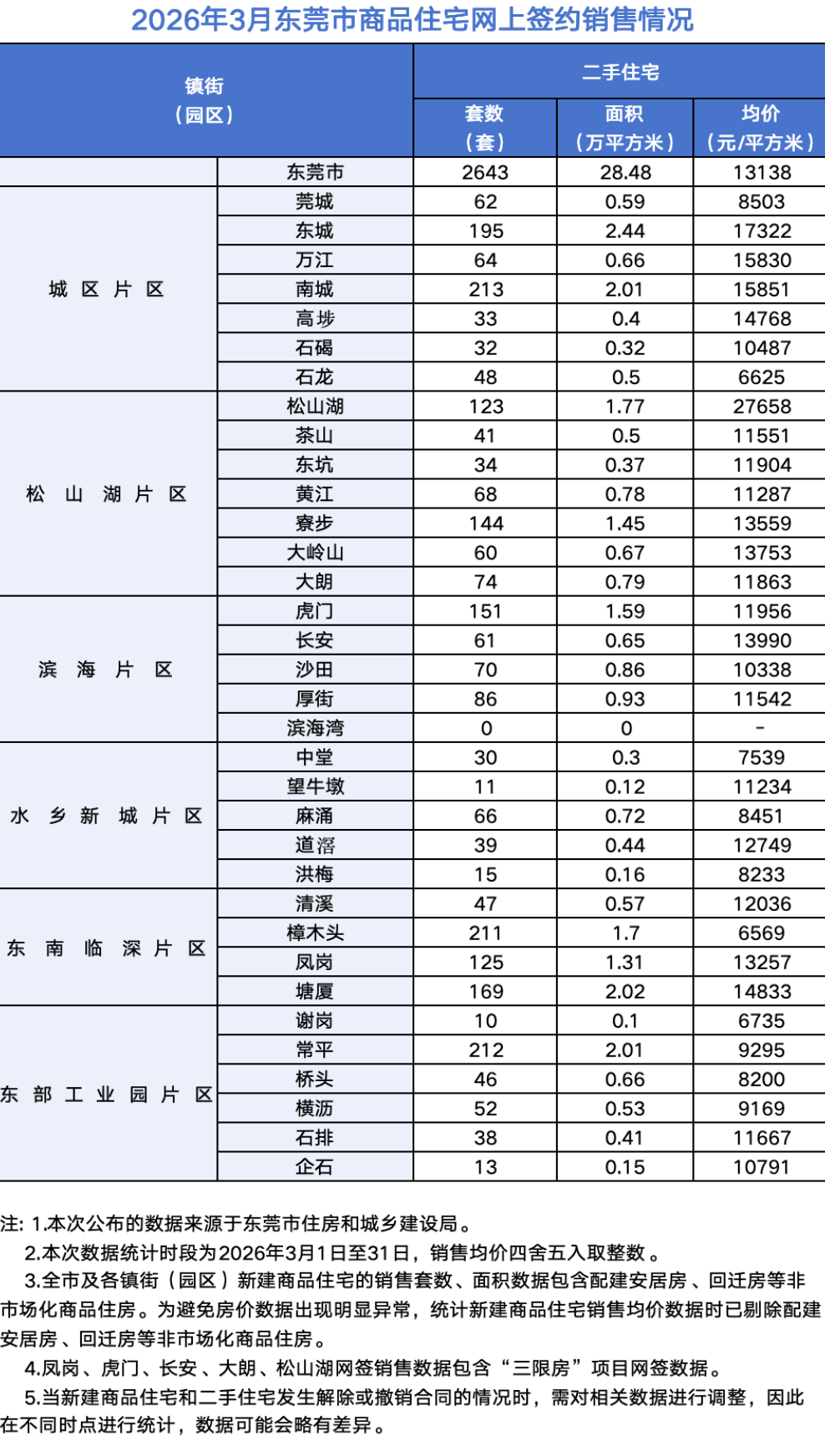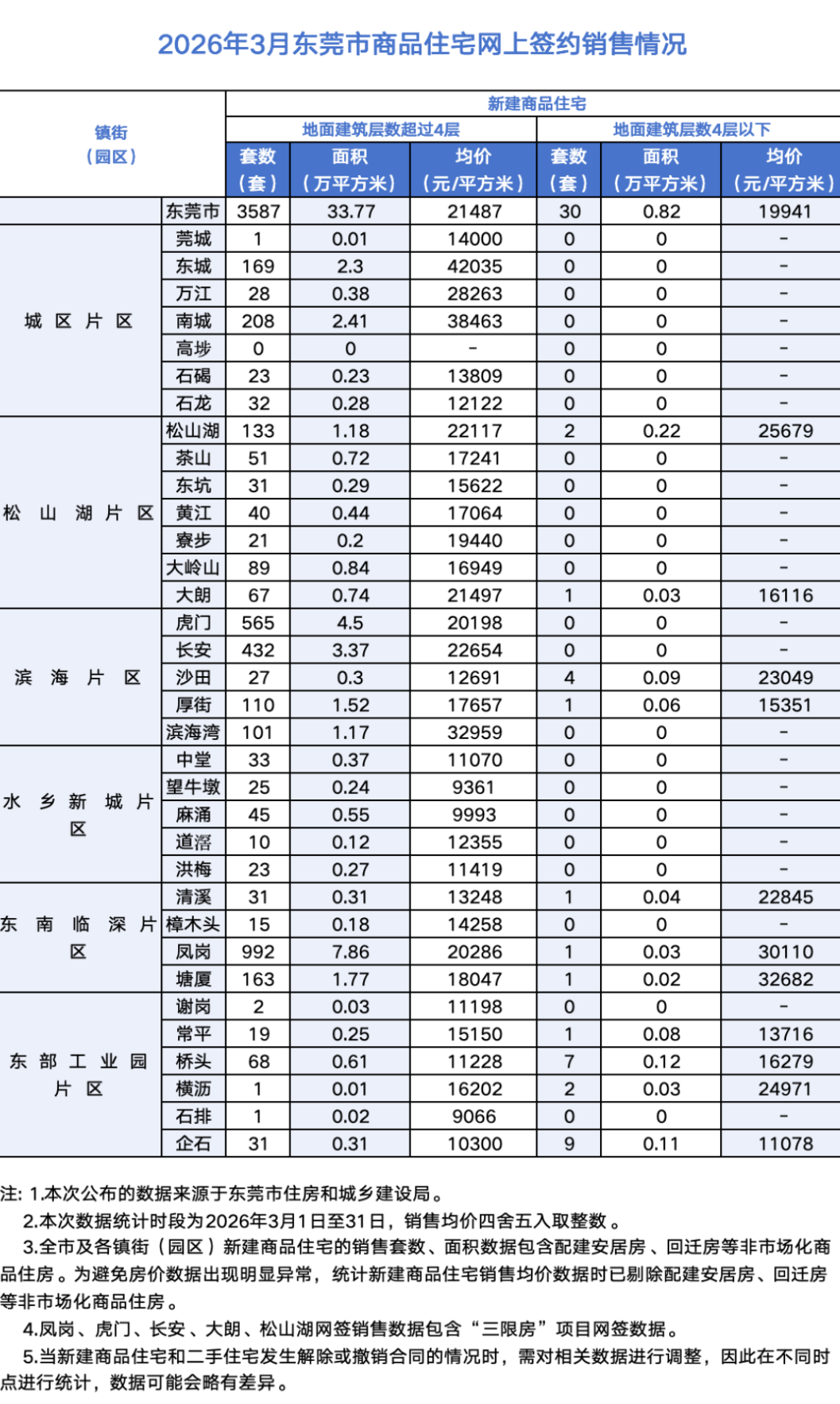 东莞最新房价出炉!4月15日,东莞市住房和城乡建设局官网发布了《2026年3月东莞市商品住宅网上签约销售情况》。